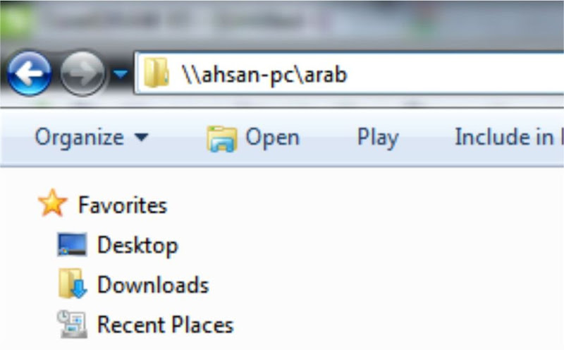 Buka Windows Explorer di komputer 2, klik pada address bar \\ahsan-pc\arab (huruf besar dan kecil sama saja). Maka akan Anda lihat, folder arab di komputer 2 sudah bisa di-akses.